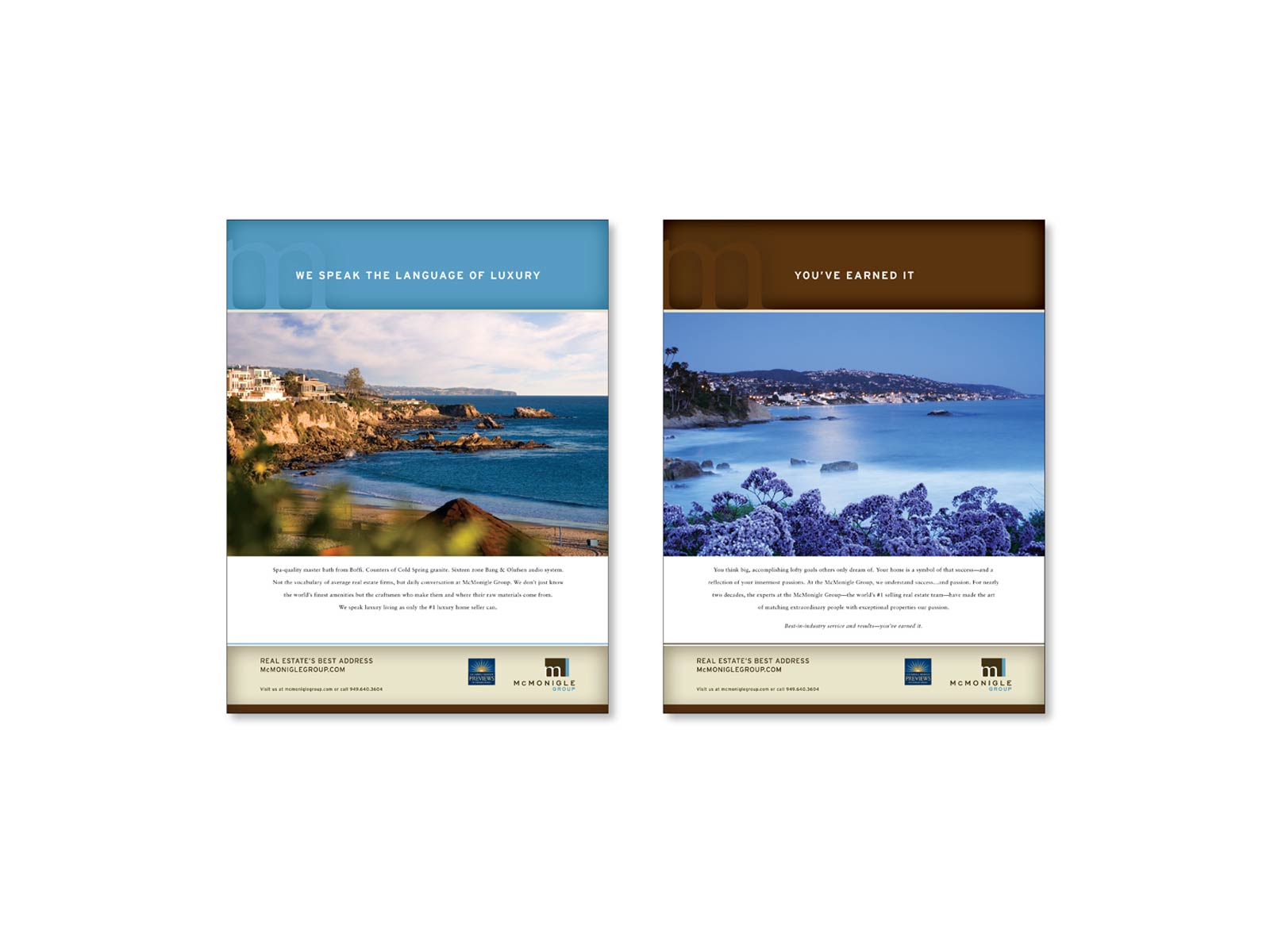John McMonigle, based in Newport Beach, California, has been the #1 selling real estate agent the last three years. The McMonigle Group needed a new identity that would reflect their unprecedented success. DRA designed their fully integrated branding program to include marketing collateral, listing presentations, property brochures, and an ad campaign that embodied the qualities of the distinguished McMonigle Group. To keep in the continuity of their newly branded look, David Riley Associates designed the interiors of their sophisticated headquarters in Newport Beach and Laguna Niguel.