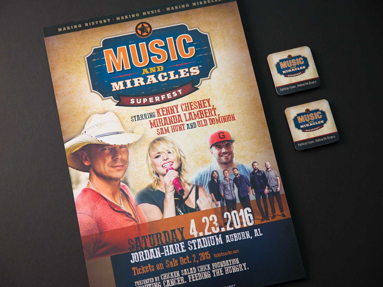 Featuring top country performers Kenny Chesney, Miranda Lambert, Sam Hunt, and Old Dominion, Music & Miracles Superfest aims to raise awareness and funds to fight cancer and feed the hungry. With this goal, Music and Miracles Superfest contracted DRA for the branding and overall identity for this extraordinary concert series. DRA had the pleasure of creating the promotional brochures, posters, apparel, website, and the marketing collateral. Making history, making music, making miracles.