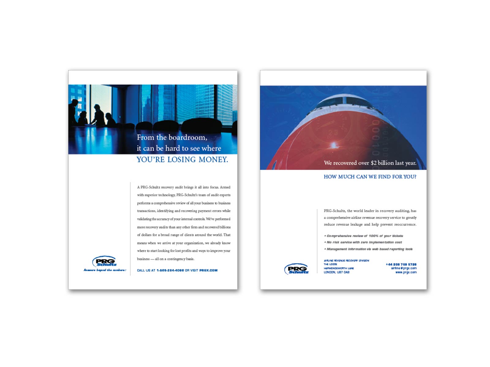 Headquartered in Atlanta, Georgia, PRG Schultz, Inc. is the worlds leading provider of recovery audit services. With over 1,600 employees, the company operates and serves in more than 30 countries and provides its services to over 75% of the top global retailers. PRG engaged DRA to create a full integrated branding program, and marketing campaign for their worldwide offices. DRA had the privelage of working with PRG for several years assisting them in their continued growth and expansion. The numbers added up to a very successful relationship.