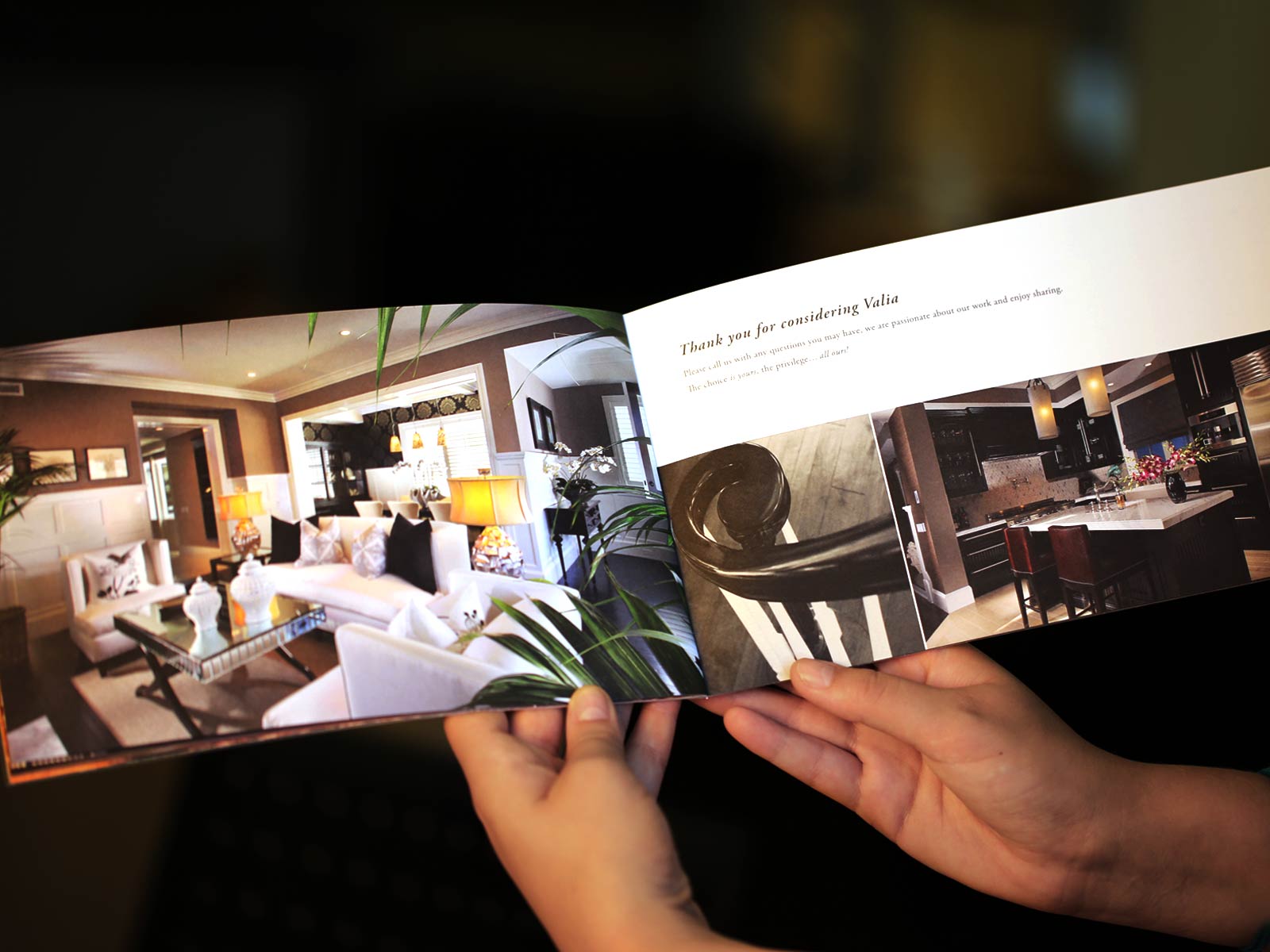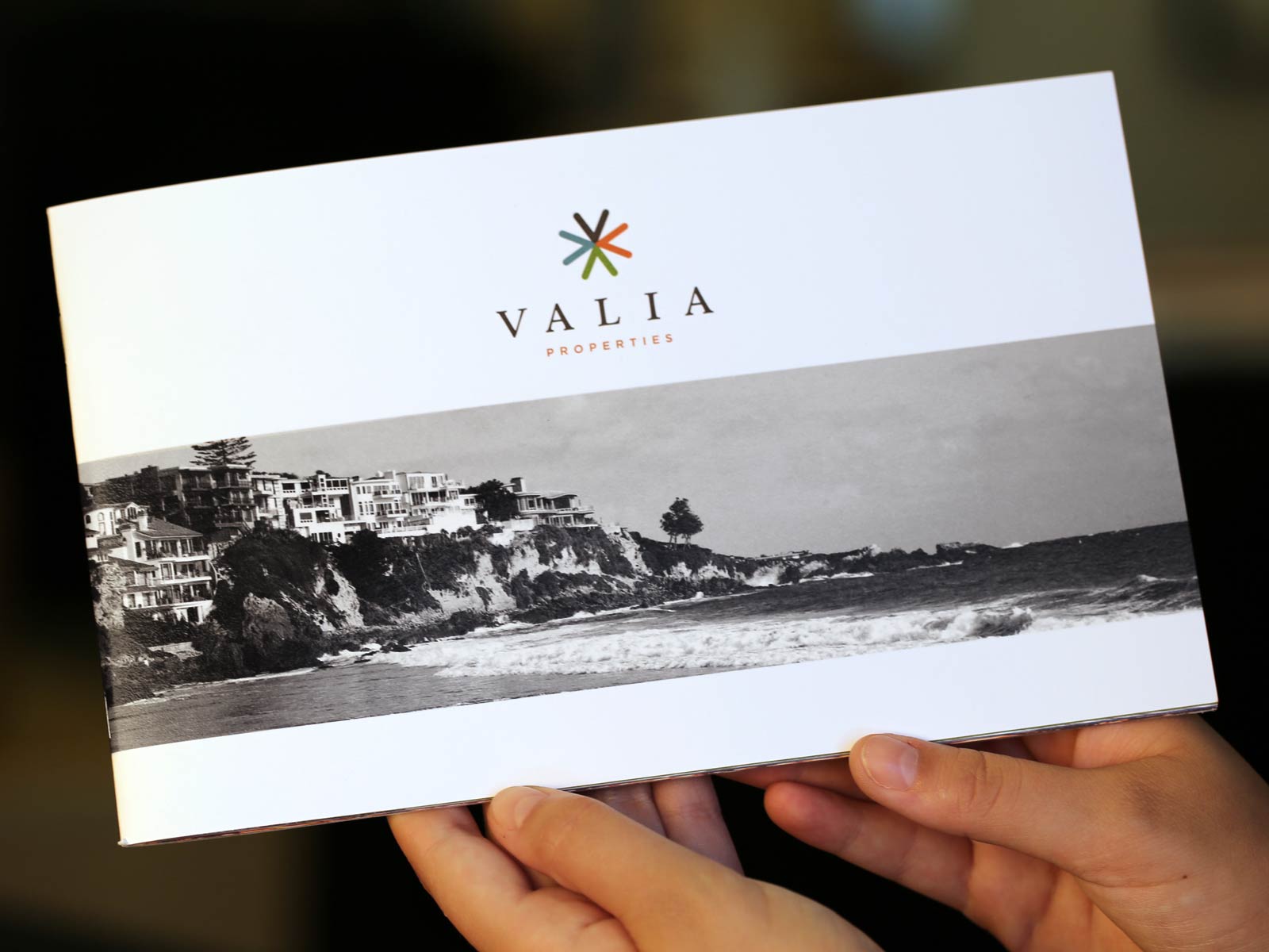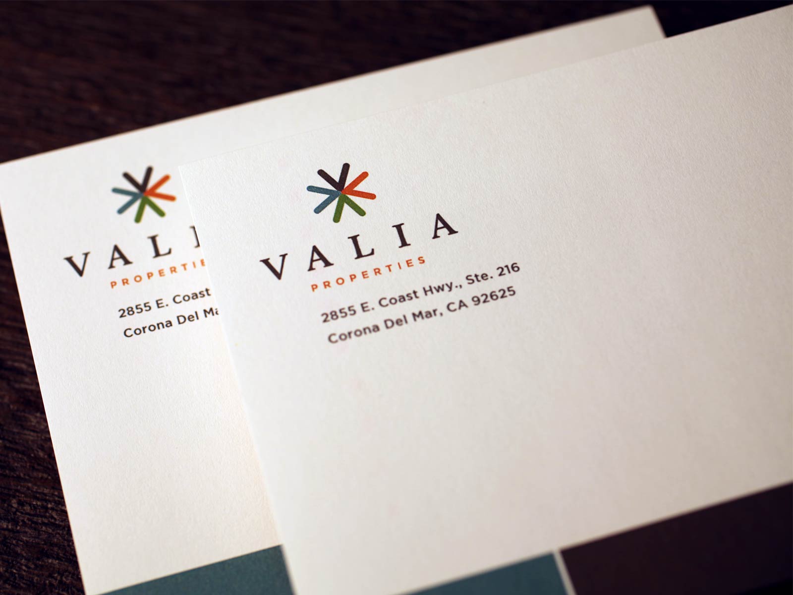 DRA had the pleasure of developing the nomenclature, identity and marketing materials for Valia Properties, a Southern California real estate firm which ranks among the top 100 in the Wall Street Journal for real estate sales teams in the United States. The seasoned brokers and agents at Valia Properties are devoted to crafting excellent client experiences as they find homes that radiate comfort, luxury and tranquility. Their name and branding exemplifies this vision from the elegant typeface to the sophisticated color palette.